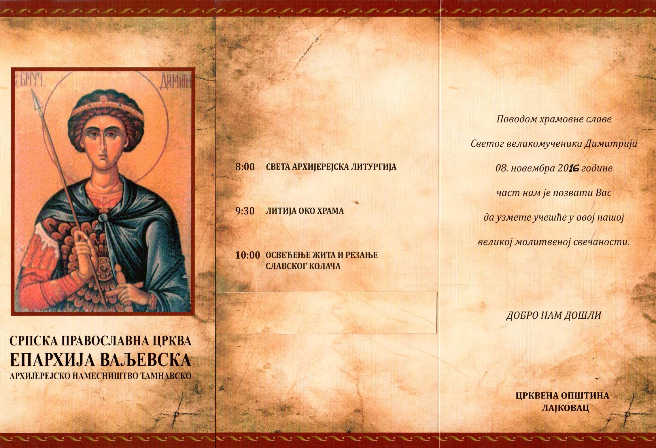 У уторак 8. новембра је слава Црквене општине Лајковац, Свети великомученик Димитрије, у народу познатији као Митровдан. Слава ће бити свечано обележена у Храму Светог Димитрија у Лајковцу. Света архијерејска литургија је у 8 сати, литија у 9.30, а освећење жита и резање славског колача у 10 сати.