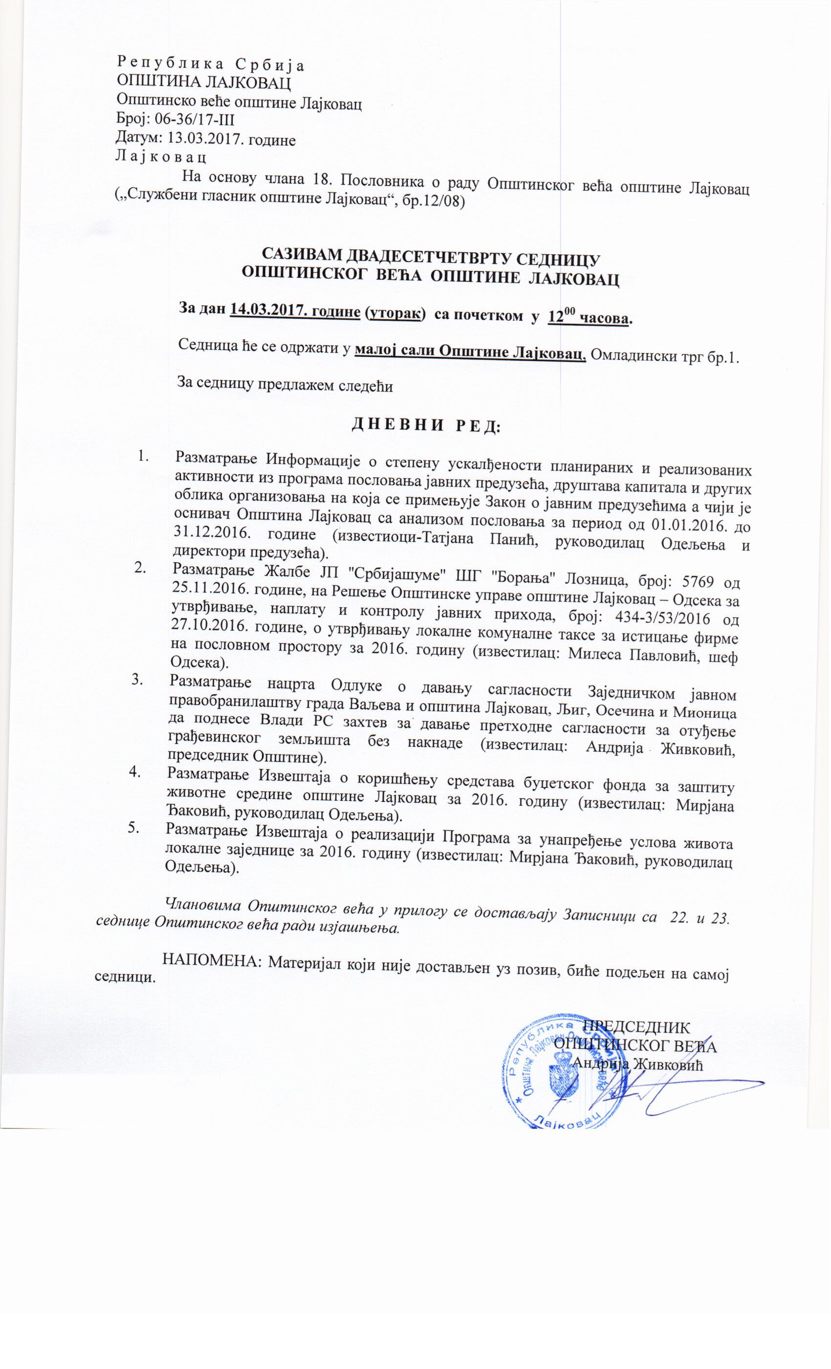 У уторак 14. марта с почетком у 12 часова одржаће се 24. седница Општинског већа Лајковца. ДНЕВНИ РЕД.