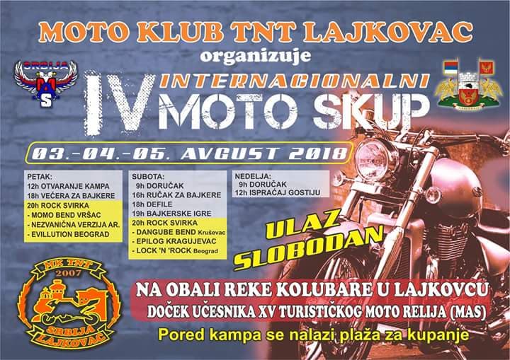 Овог викенда, од петка до недеље, у Лајковцу се одржава 4. Интернационални мото скуп на Колубари, чији је рганизатор Мото клуб “ТНТ” Лајковац. Скуп моториста је већ у петак увече на обали реке Колубаре, поред “Јолића” воденице. Очекује се преко хиљаду бајкера из Србије и бивших држава