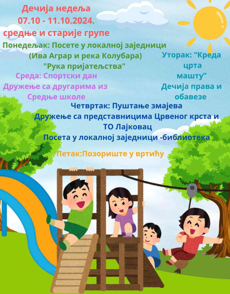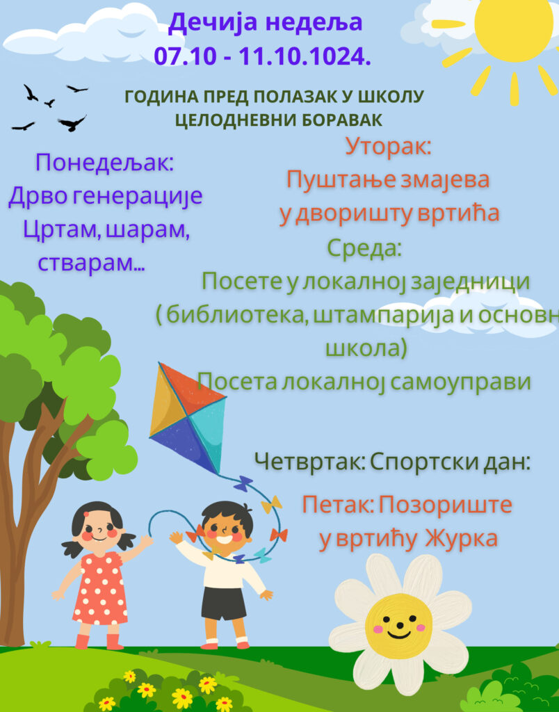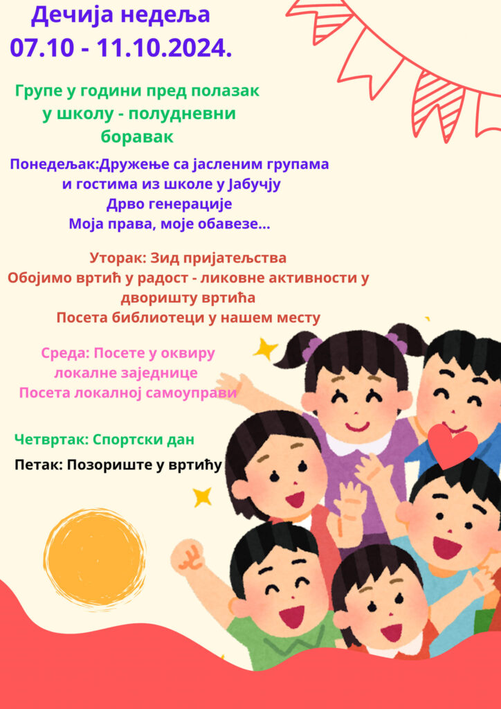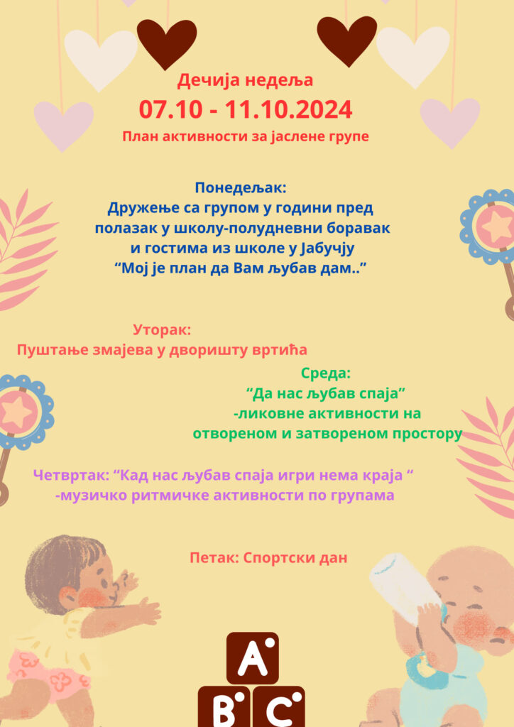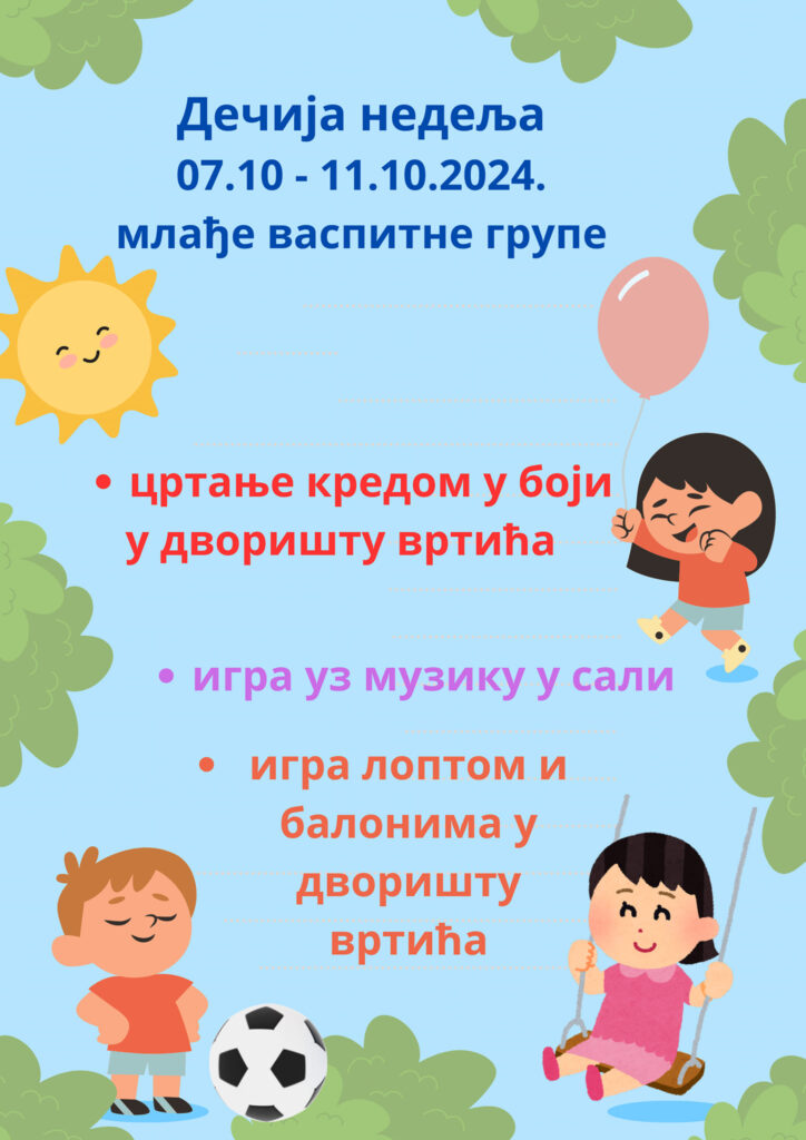 Овогодишња Дечја недеља одржава се од 7. до 13. октобра под слоганом „Ја сам дете, имам план: толеранција и љубав за сваки дан“. Предшколска установа „Лептирић“ традиционално осмишљава и организује богат програм за своје узрастне васпитно-образовне групе, а какве су активности планиране од понедељка до петка погледајте на постерима.