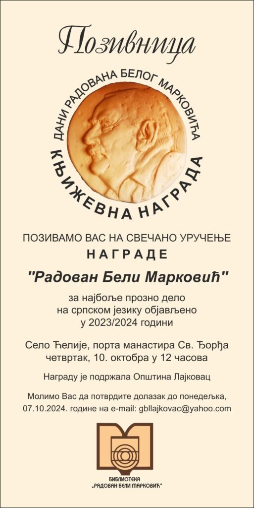 Свечано уручење Књижевне награде „Радован Бели Марковић“ за најбоље прозно дело на српском језику објављено 2023/24. године биће уприличено у четвртак 10. октобра у селу Ћелије, у порти манастира Светог Ђорђа, с почетком у 12 часова. Трећи по реду лауреат је Александар Гаталица за збирку прича „Друга виолина и друге приче“ у издању Академске књиге из Новог Сада. На конкурс је пристигло 106 дела.
