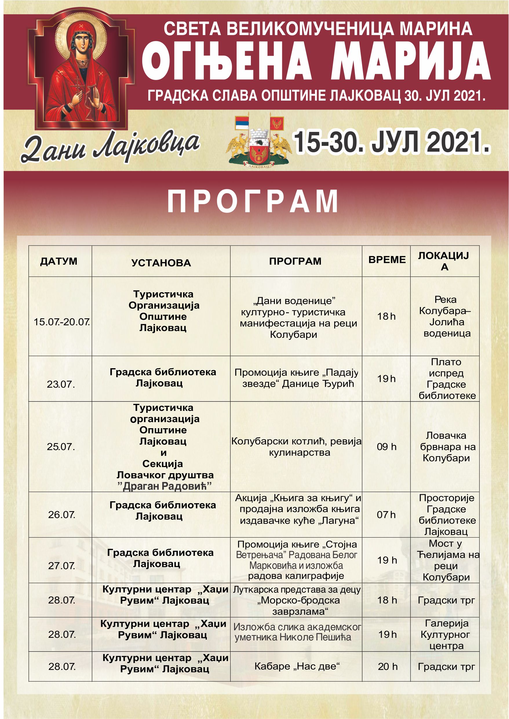 У петак 30. јула од 9 часова је света архијерска литургија поводом славе насеља Огњене Марије, после чега ће у порти цркве Светог Димитрија наступити хор „Серафим“ и фолклорни ансамбл КЦ „Хаџи Рувим“. Тог дана је и велики народни вашар, а у вечерњим сатима и финиш манифестација „Дани Лајковца“: од 21 сат концерт групе „Бритке сабље“, а од 22 часа концерт поп-фолк певача и композитора Пеђе Меденице.