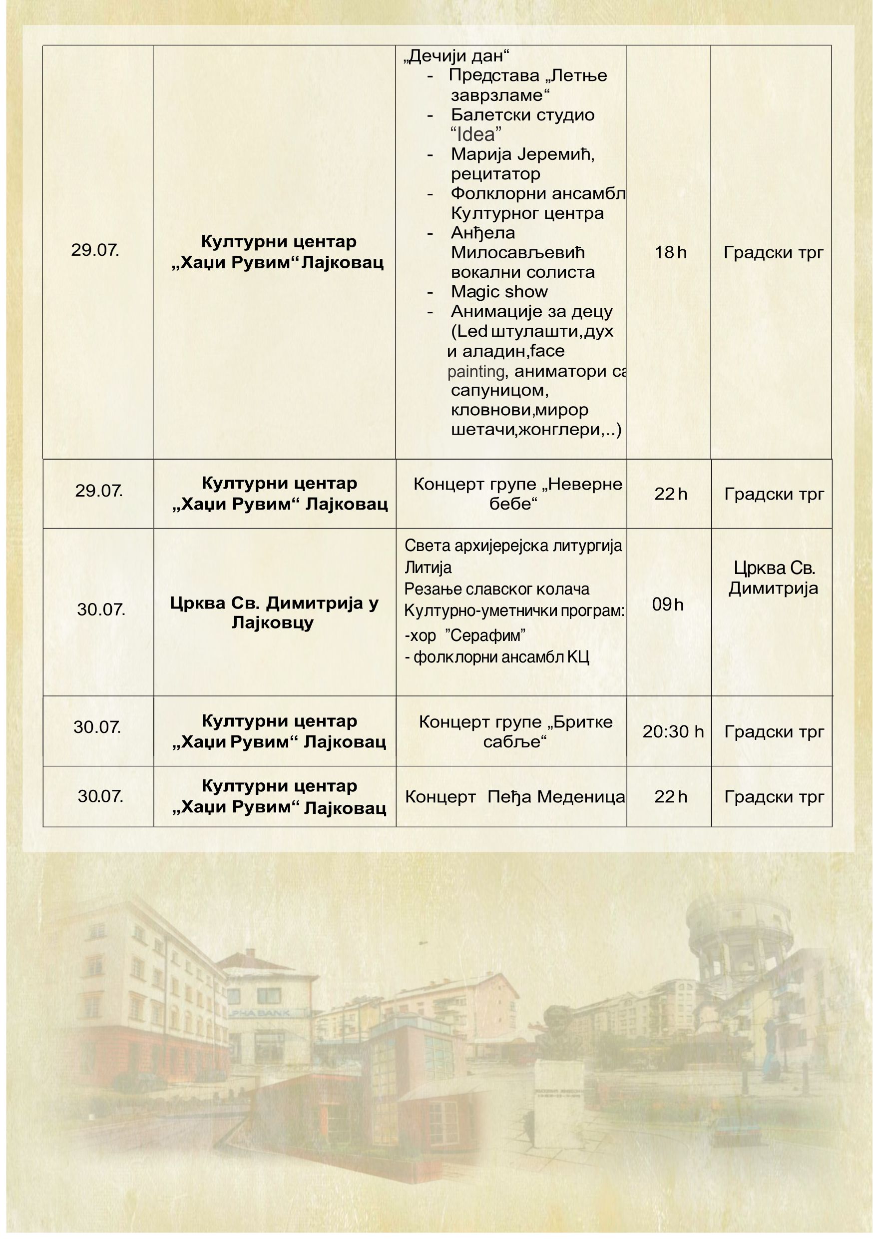 На Градском тргу 29. јула од 18 часова је увек популарни Дечји дан, на којем најмлађе очекују позоришна представа, наступи фолклорног и балетског ансамбла, вокалних солиста, мађионичари, кловнови, жонглери, аниматори итд. У 22 сата је концерт познатог рок састава Неверне бебе.