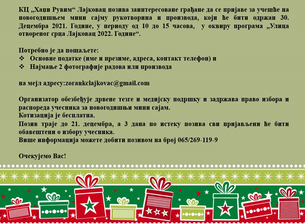 Културни центар Хаџи Рувим упутио је позив свим заинтересованим грађанима да се до 21. децембра пријаве за Новогодишњи сајам рукотворина и производа, који ће се одржати 30. децембра у оквиру Улице отвореног срца на Градском тргу у Лајковцу. Детаљније: