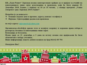 КЦ „Хаџи Рувим“ Лајковац позива заинтересоване грађане да се пријаве за учешће на новогодишњем мини сајму рукотворина и производа, који ће бити одржан 29. децембра у периоду од 10 до 15 часова, у оквиру програма „Улица отвореног срца Лајковац 2019“. Потребно је да пошаљете основне податке (име и презиме, адреса, контакт телефон) и најмање 2 фотографије радова или производа на мејл адресу: snjovanovic@yahoo.com. Котизација је бесплатна. Организатор обезбеђује дрвене тезге и медијску подршку и задржава право избора и распореда учесника за новогодишњи мини сајам. Позив траје до 21 .децембра, а три дана по истеку позива сви пријављени ће бити обавештени о избору учесника. Више информација можете добити позивом на број 064/42-05-794. Очекујемо Вас!