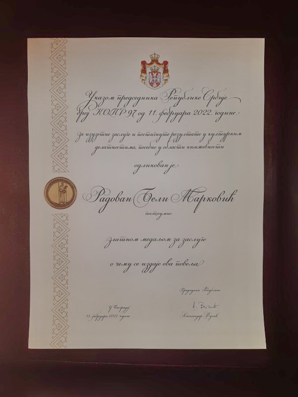 Недавно преминули Радован Бели Марковић одликован је за изузетне заслуге и постигнуте резултате у културним делатностима, посебно у области књижевности, пише у повељи која прати Златну медаљу као државно признање.