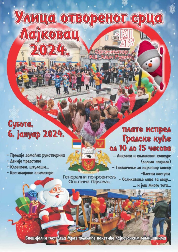 Традиционална манифестација „Улица отвореног срца“ у Лајковцу, на радост најмлађих суграђана, одржаће се у суботу 6. јануара од 10 до 15 часова, на платоу испред Градске куће.