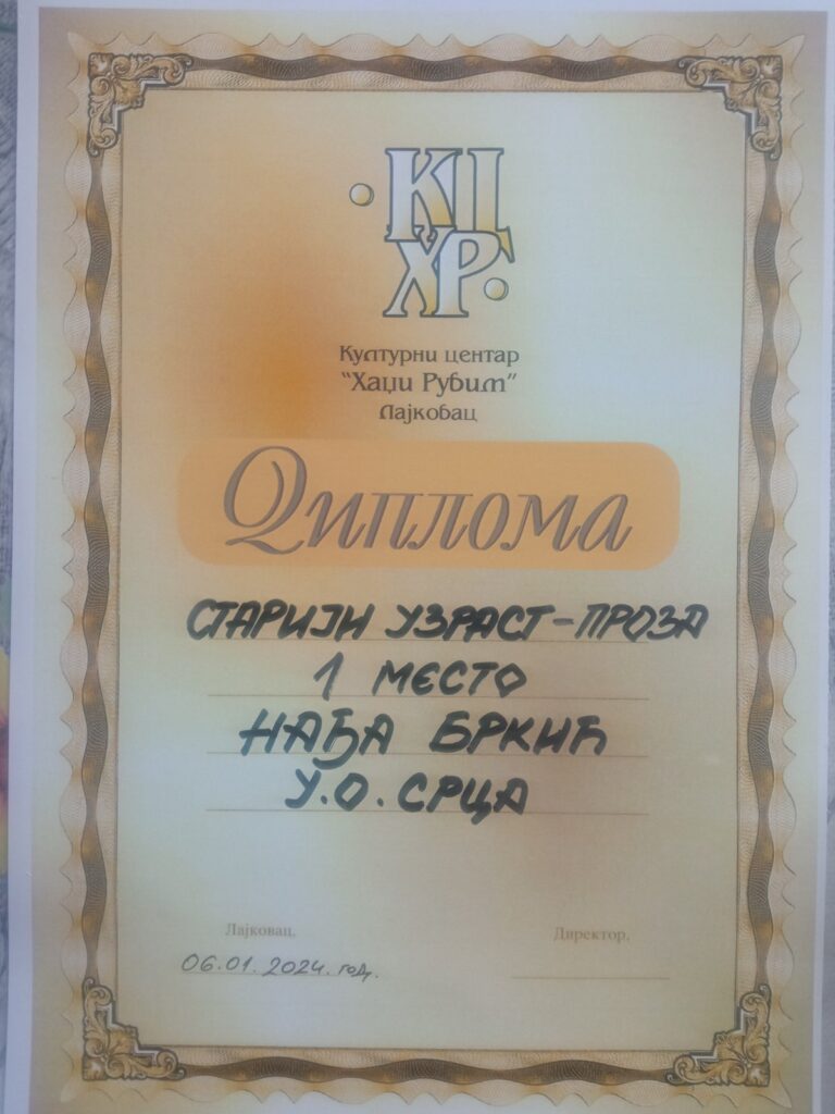 Нађа Бркић освојила је прву награду у категорији проза за причу „Буди хуман”. Виктор Ранковић освојио је прву награду у категорији поезије за песму „Будимо у невољи пријатељ прави”. Додела диплома и награда одржана је у оквиру „Улице отвореног срца” 8. јануара на Градском тргу у Лајковцу, када су ученици пред многобројном публиком представили своје награђене литерарне радове.