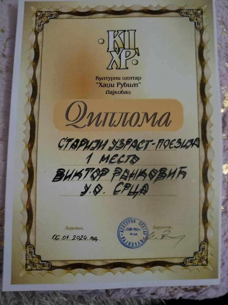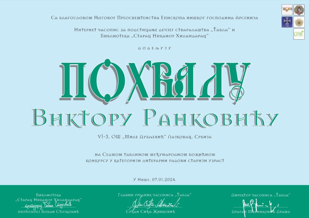 Виктор Ранковић, ученик 6. разреда, награђен је и на VII међународном литерарном божићном конкурсу за песму „Рођење Христово – празник радости”. Викторова песма нашла се међу једанаест награђених – добио је похвалу у конкуренцији 176 литерарних радова ученика од 5. до 9. разреда основних школа из Србије, Бугарске, Северне Македоније, Црне Горе и БИХ. Конкурс седми пут организује Интернет часопис за подстицање дечјег стваралаштва „Табла” у сарадњи са Библиотеком „Старац Никанор Хиландарац” (Храм Васкрсење Христово у Нишу) и под покровитељством епископа нишког Арсенија.