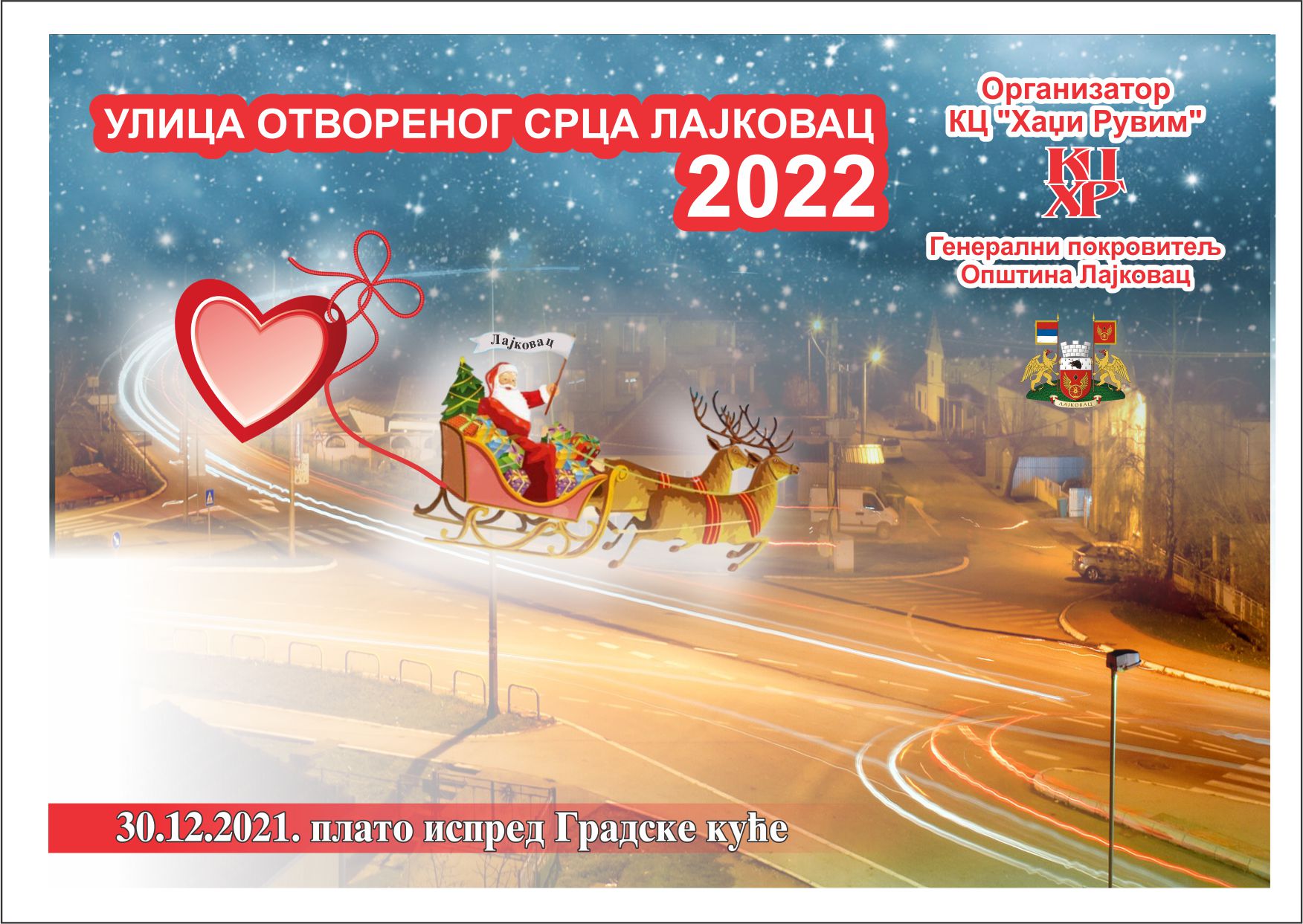 Традиционална „Улица отвореног срца“ у Лајковцу одржава се у четвртак 30. децембра од 10 до 16.30 сати, на платоу испред Градске куће. Организатор је Културни центар „Хаџи Рувим“, у сарадњи са другим општинским установама и организацијама, а покровитељ општина Лајковац.
